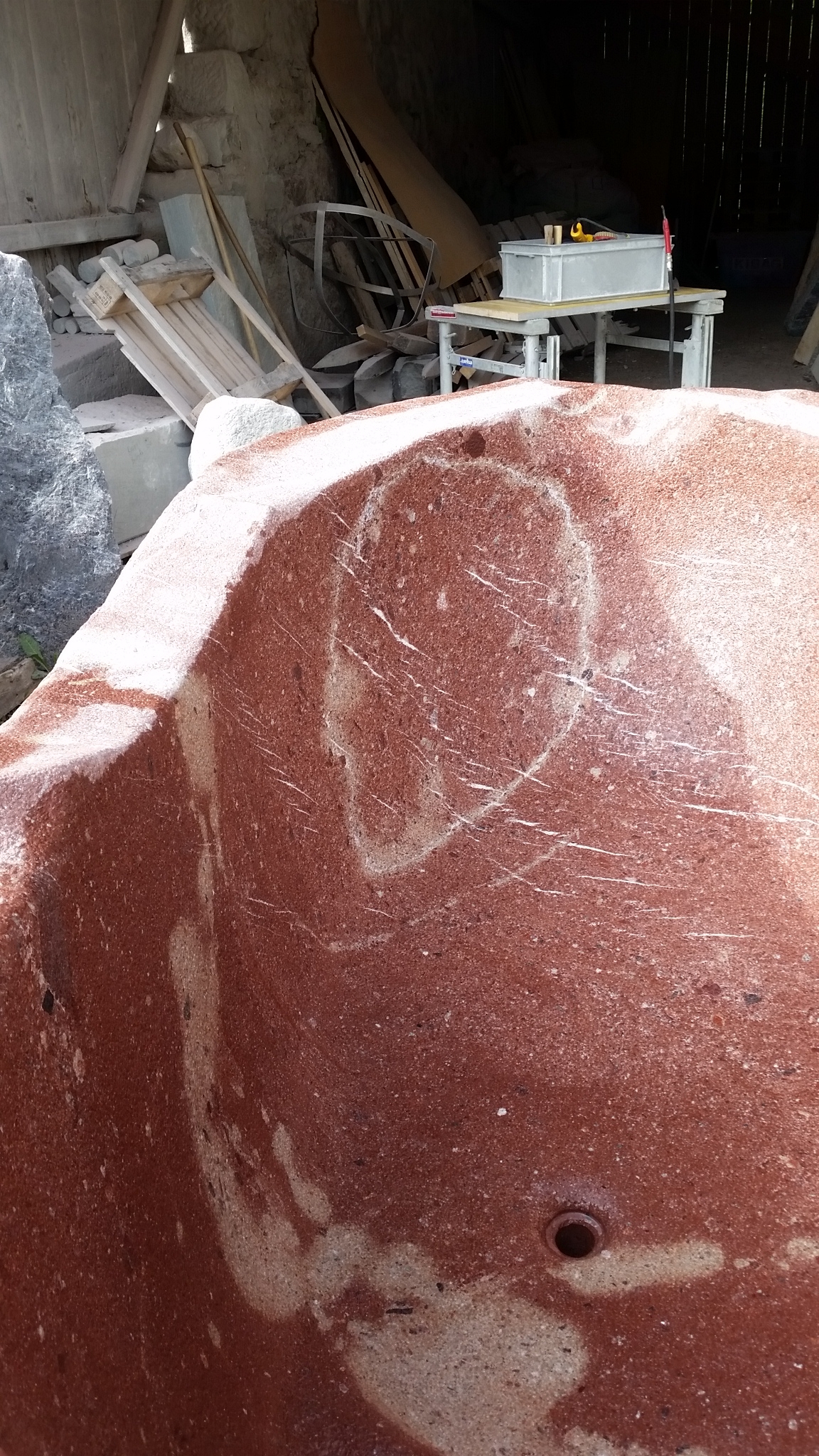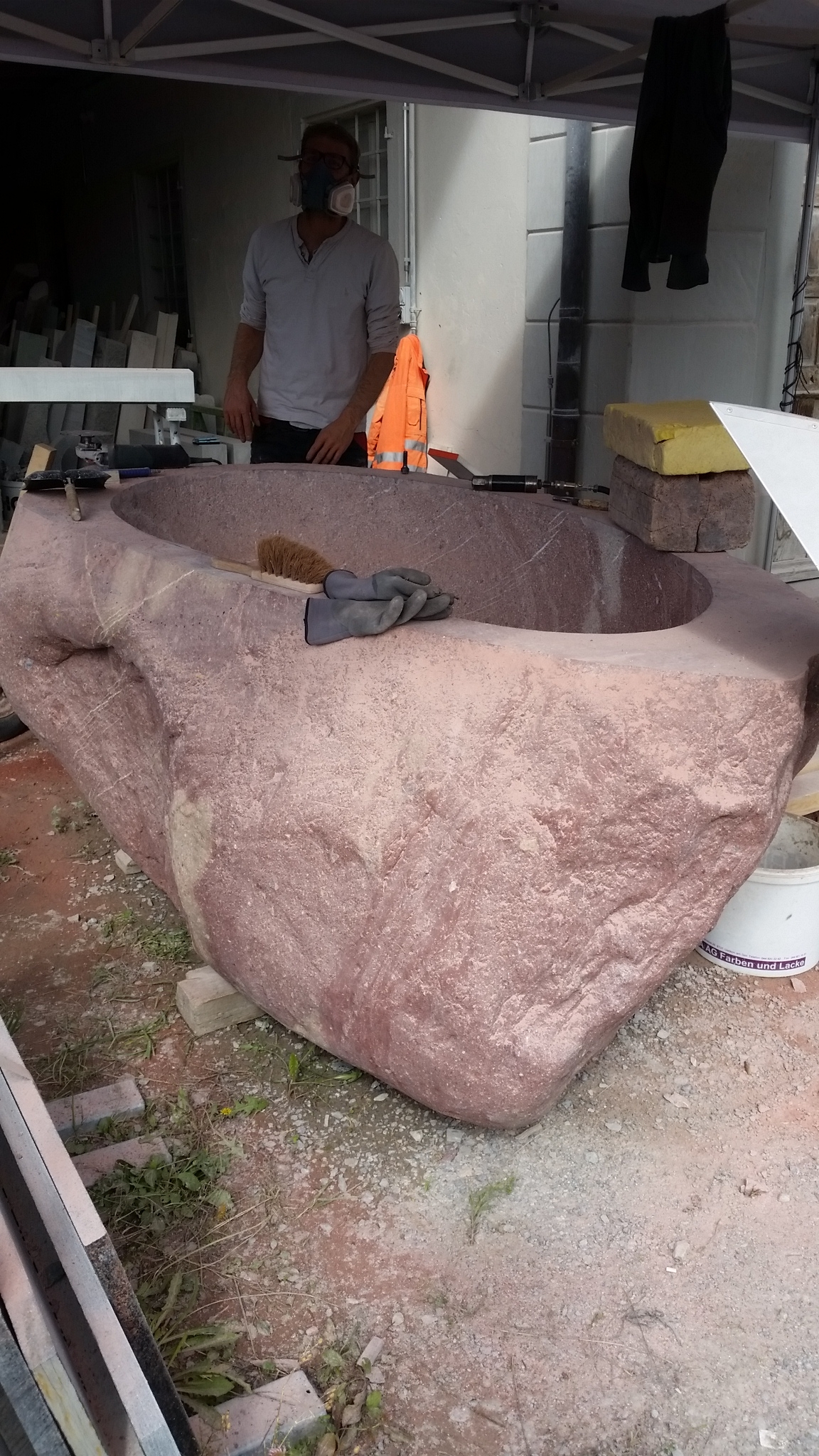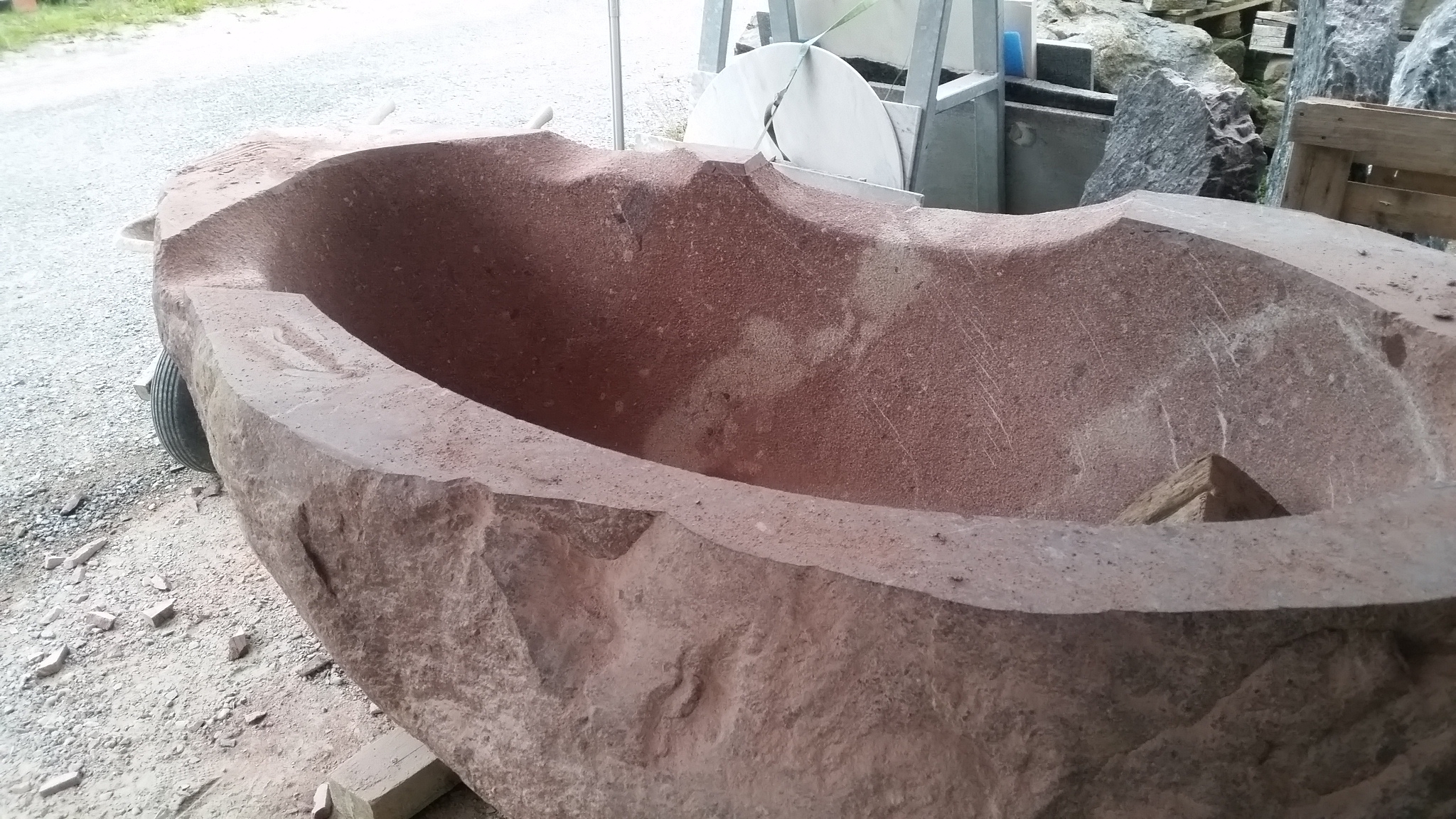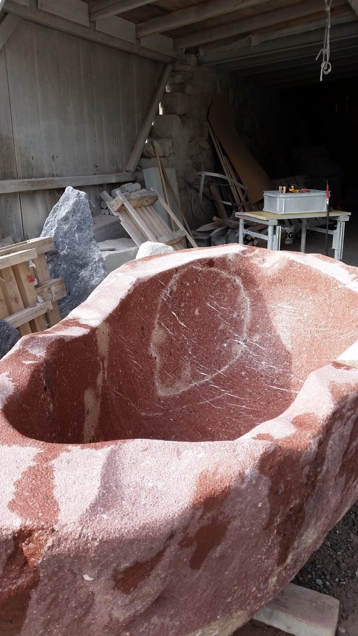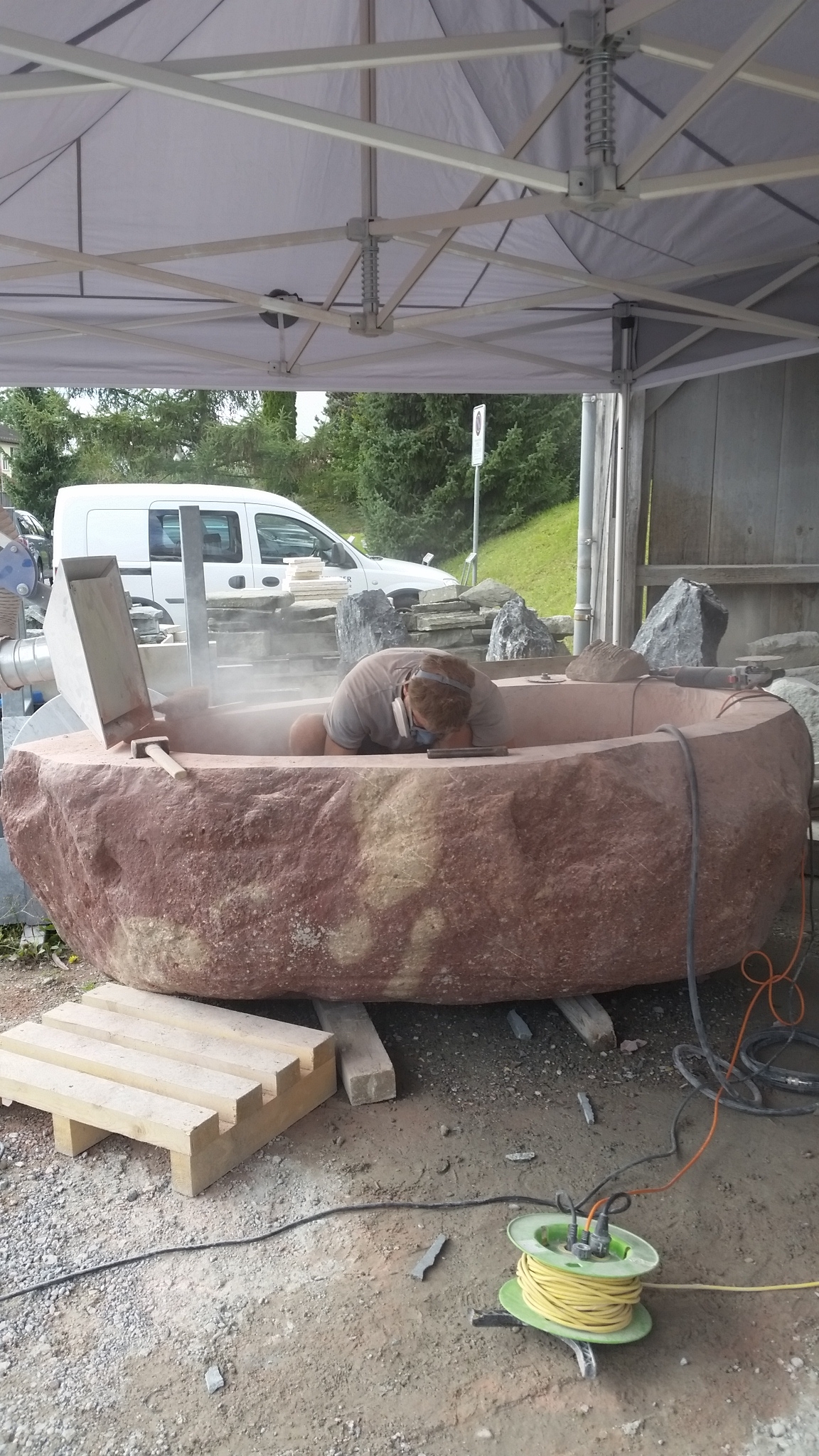Aus dem Glarner Rotrisi Findling, der ursprünglich 5.8 Tonnen wog, wurde eine Badewanne für einen Neubau angefertigt.