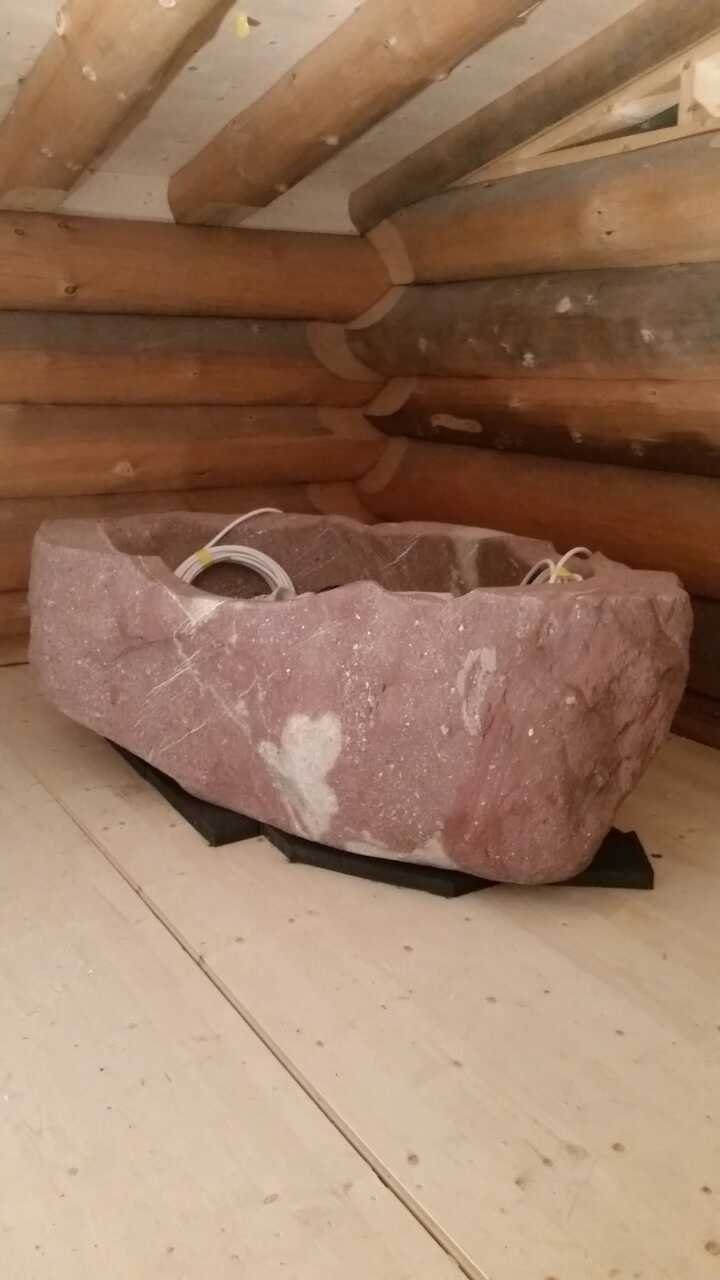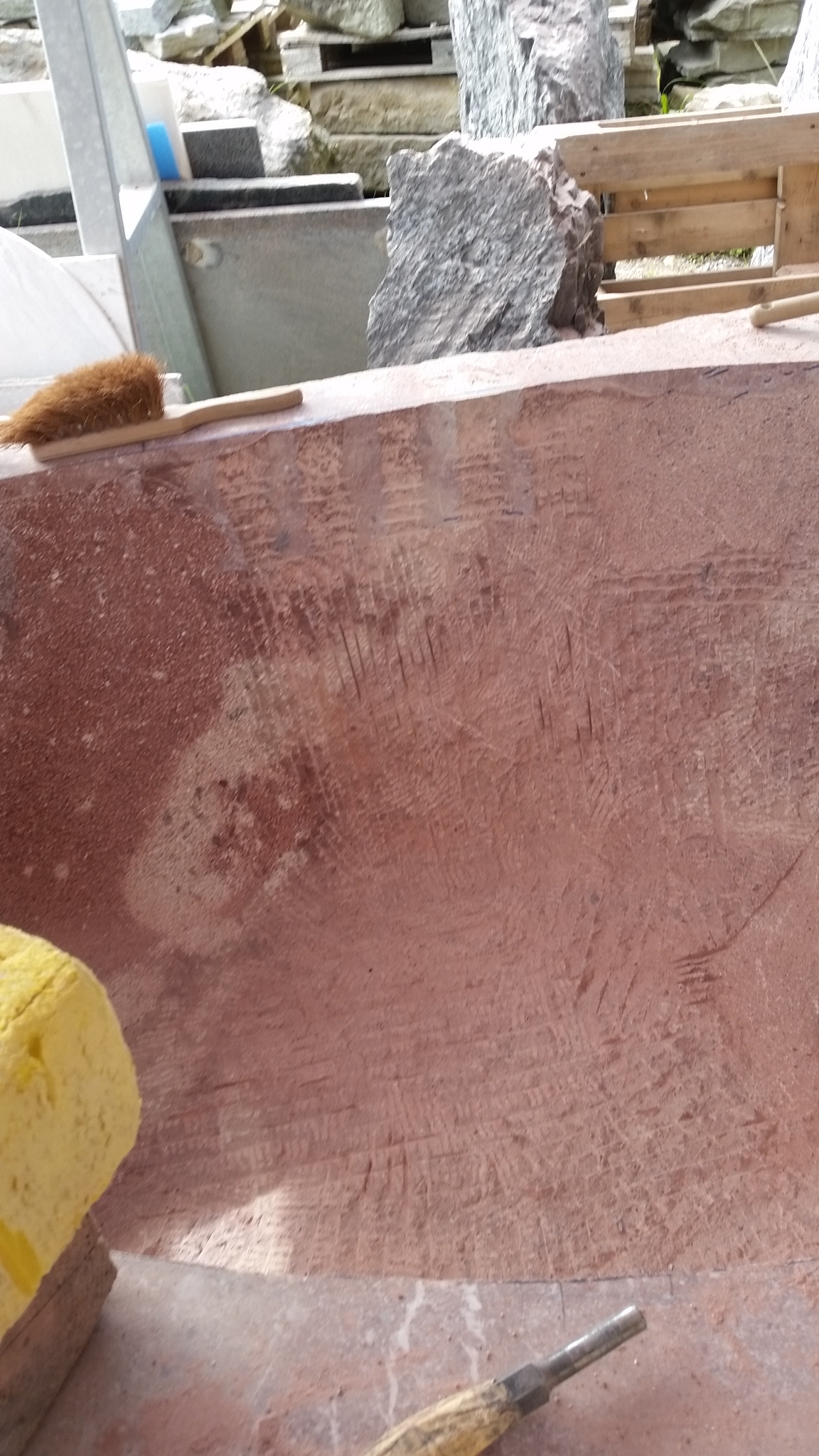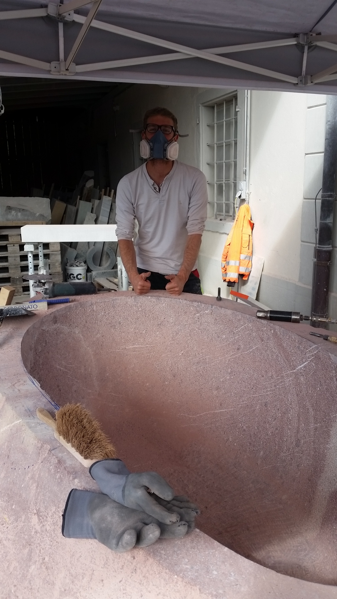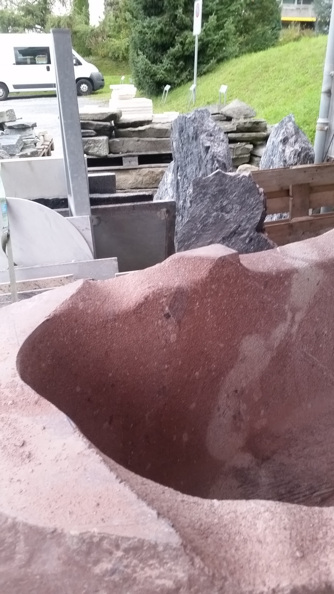 Aus dem Glarner Rotrisi Findling, der ursprünglich 5.8 Tonnen wog, wurde eine Badewanne für einen Neubau angefertigt.