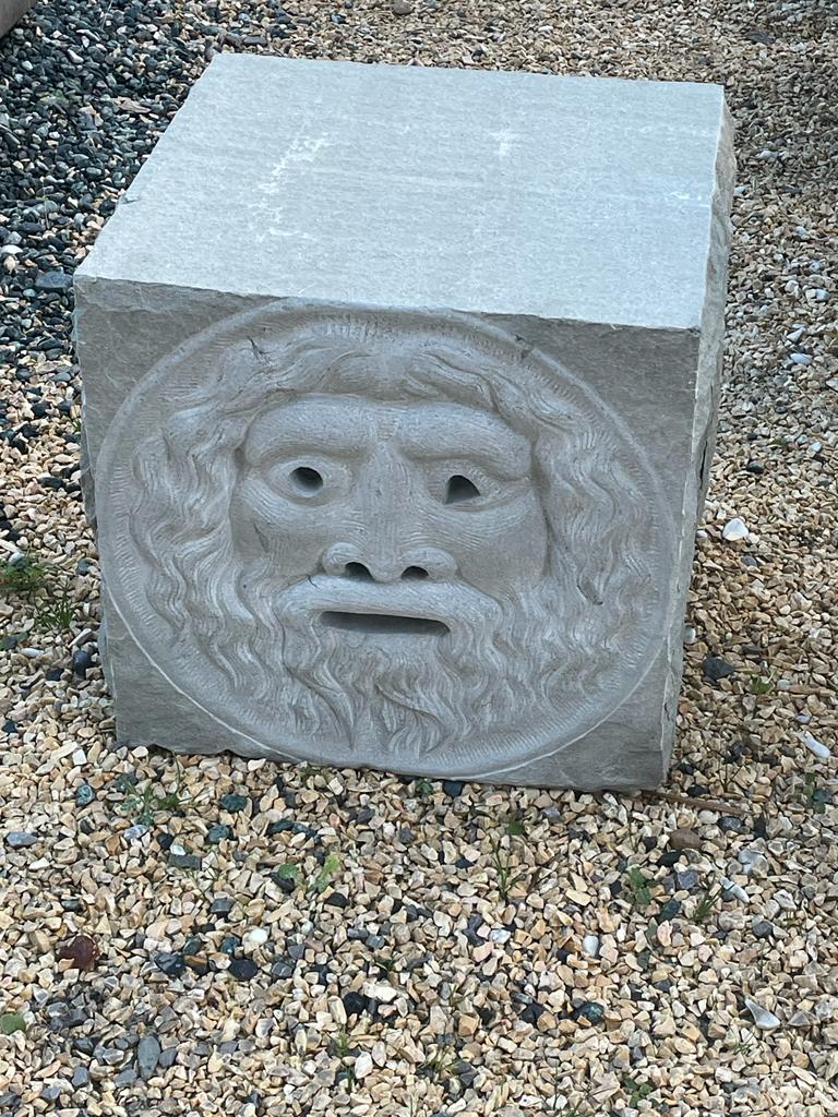 Die anderen Vier Steine der Sitzgruppe werden mit modernen Schriftzügen und Reliefs versehen, die zum Dorfmuseum passen.
