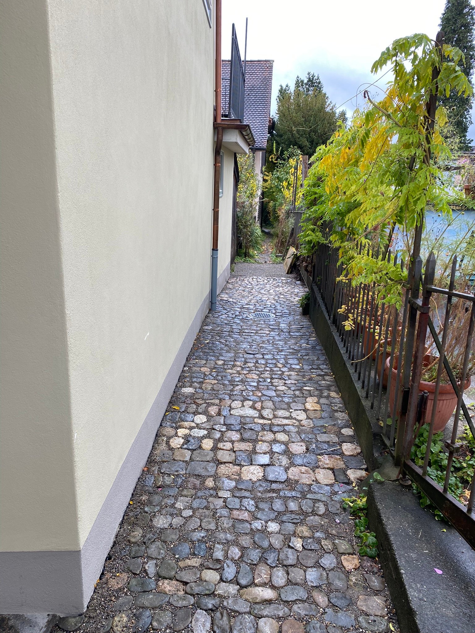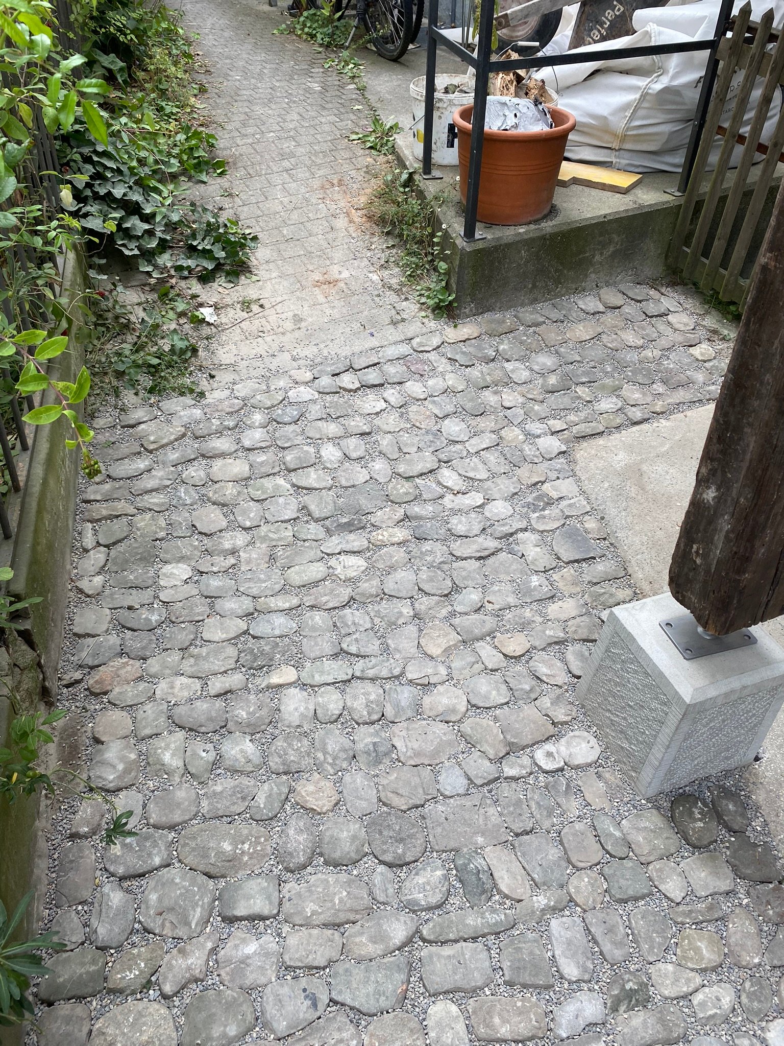 Unser Team hat den alten Betonboden und den veralteten Kopfsteinpflasterweg entfernt. Wir haben den Weg mit den ursprünglichen Steinen erneuert, für eine ästhetische Optik. Zudem ersetzten wir den Sandsteinsockel und den alten Betonboden durch Pflastersteine. Nun erstrahlt alles in frischem Glanz – eine perfekte Verbindung von Vergangenheit und Gegenwart.