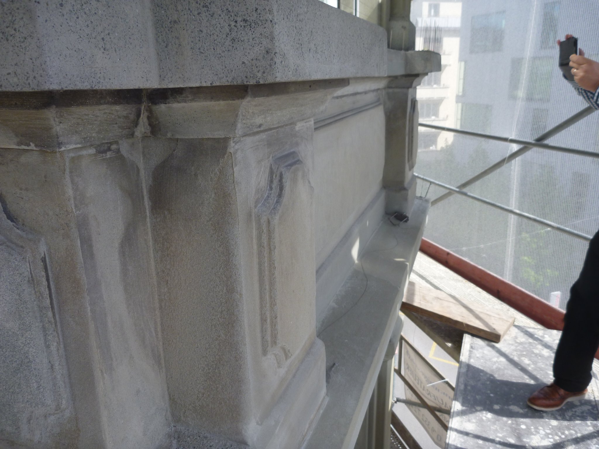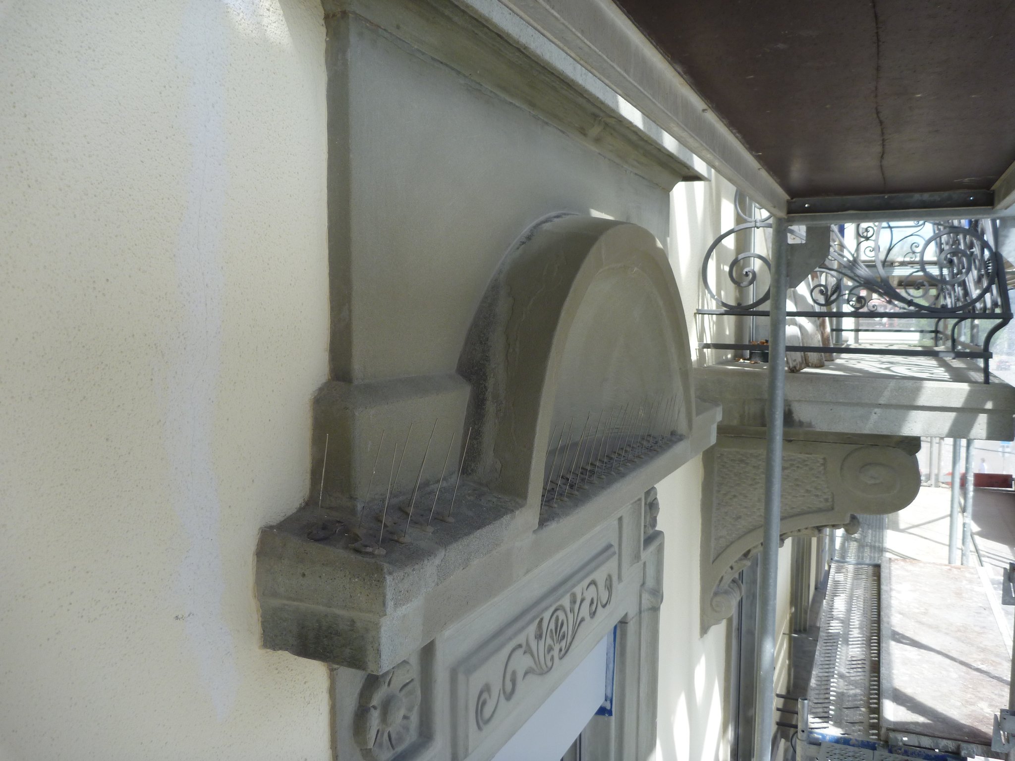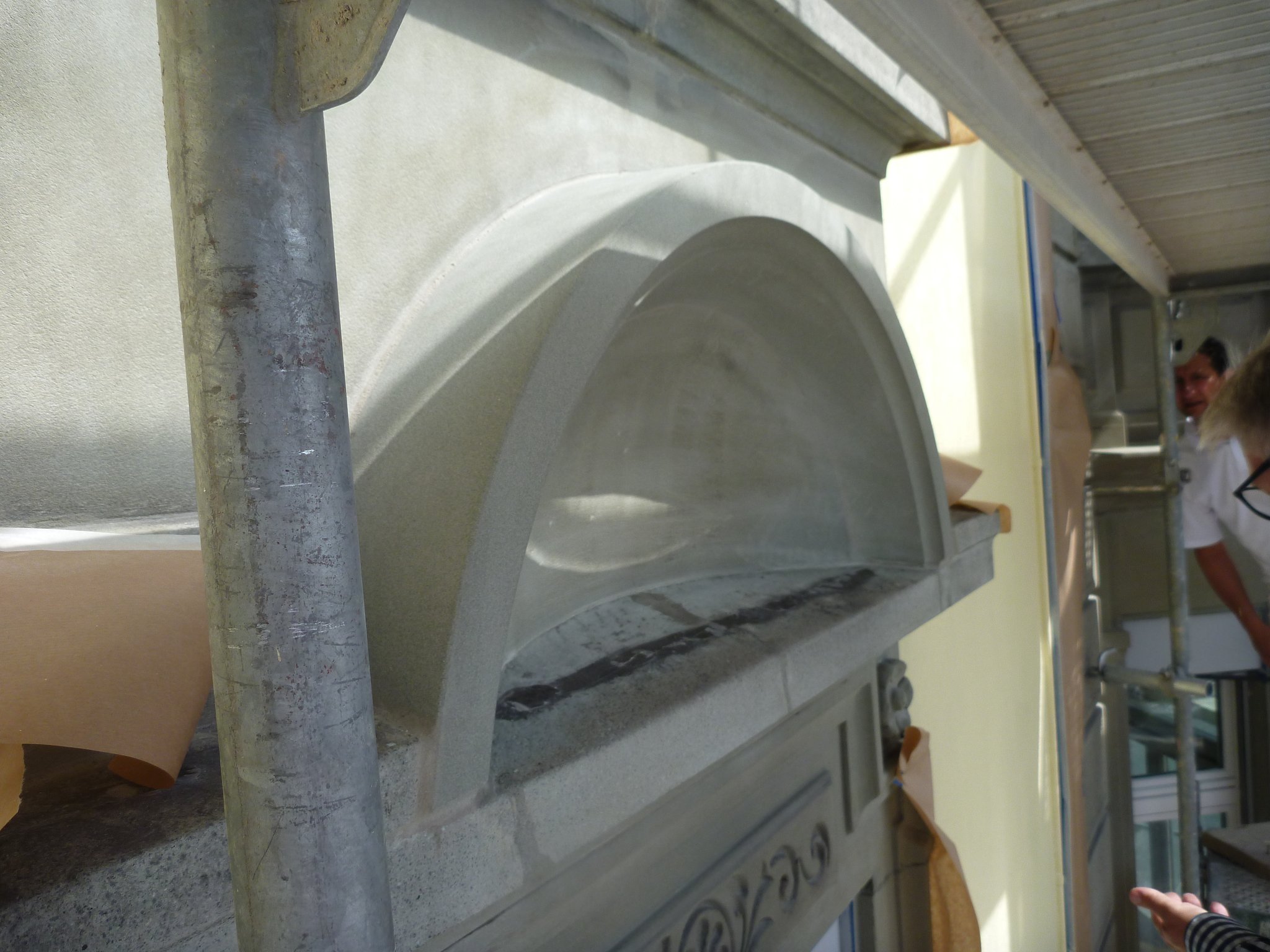 Südöstlich vom Bahnhof Stadelhofen steht das vor 1900 erbaute neoklassizistische Gebäude aus Berner Sandstein. Bei der Begutachtung des Gebäudes stellten wir Absandungen, Abplatzungen, Schalenbildungen und Risse fest. Nahezu faustgrosse Stücke waren schon auf den Vorplatz gefallen, was aus Sicherheitsgründen ein dringendes Handeln erfordert. Angemessen an die Bedürfnisse der Eigentümer und deren Budget wurden vor allem Flickarbeiten ausgeführt und nur einzelne Auswechslungen von Steinen. Insgesamt konnten wir an zwei Fassaden je eine Spitzverdachung, je zwei Rundbögen, einige Fensterbänke, Gewände, Stürze, Lisenen flicken und zum Teil auswechseln. Der Zustand des Erkers war am schlechtesten. Um die Reparaturarbeiten im gleichen Farbton zu halten, verwendeten wir Materialien der auf Berner Sandstein spezialisierten Firma Bridevaux. Schlussendlich sieht man von der Strasse aus keinen Unterschied mehr ob ein Stein geflickt oder ersetzt wurde. Wir haben saubere und sorgfältige Arbeit geleistet, die allen Freude bereitet hat.