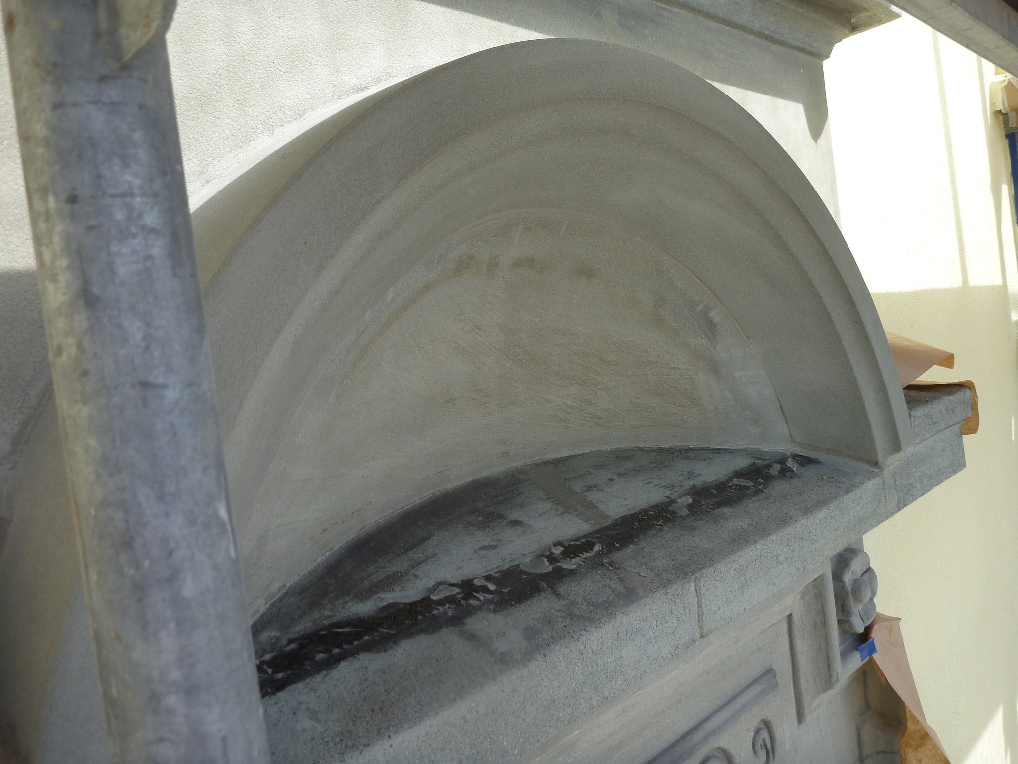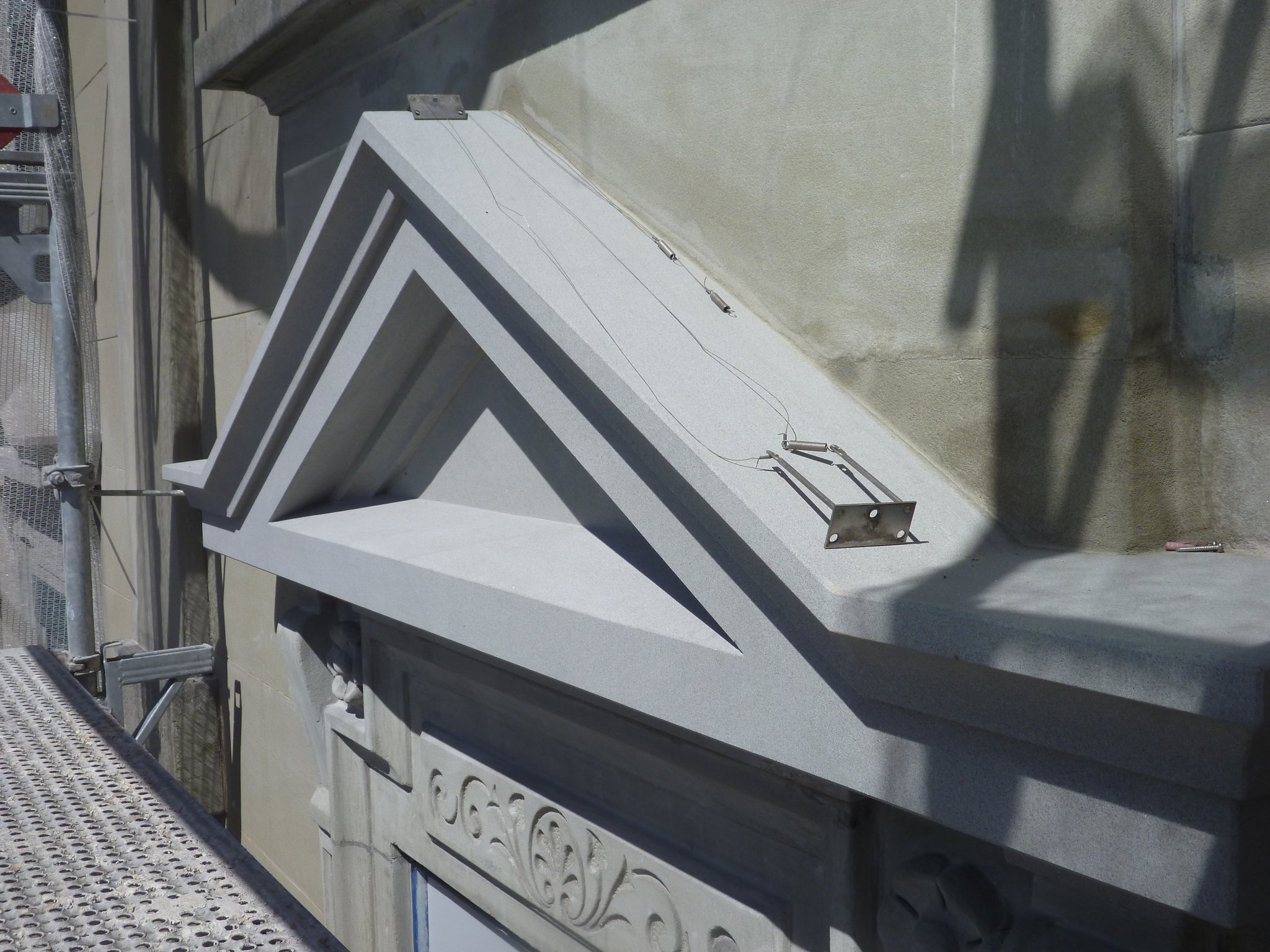 Diese wurden aus Kunststein in die richtige Grösse und Form gegossen und danach bearbeitet. Danach wurden die bis zu zwei Tonnen schweren Elemente mit aufwändiger Kranarbeit millimetergenau auf die vorgesehenen Fundamente versetzt. Um die Stabilität zu gewährleisten, wurden die extra dafür in die Elemente einbetonierten Gewindestangen in die neuen Fundamente eingelassen und die ganze Konstruktion ausgegossen.