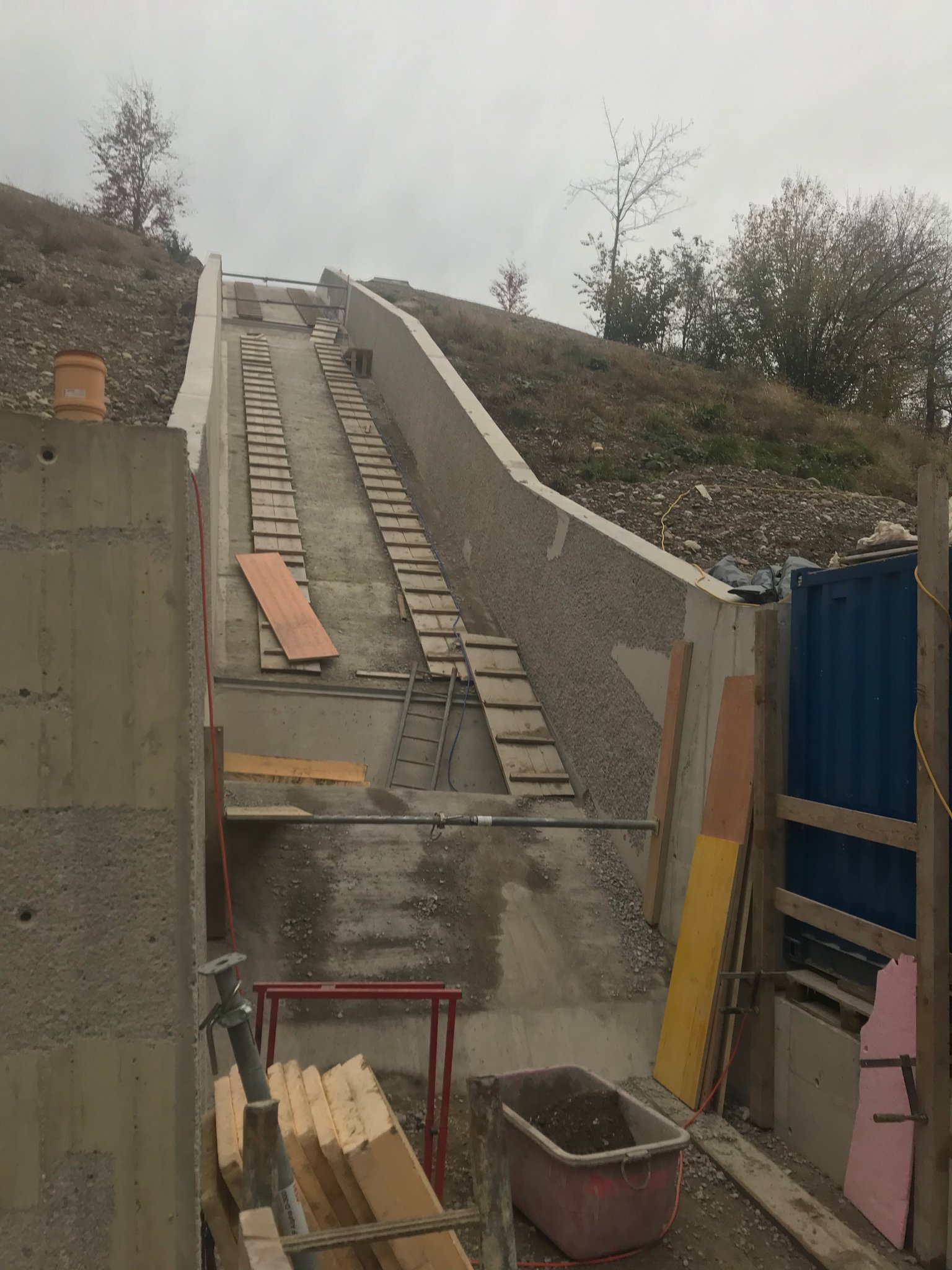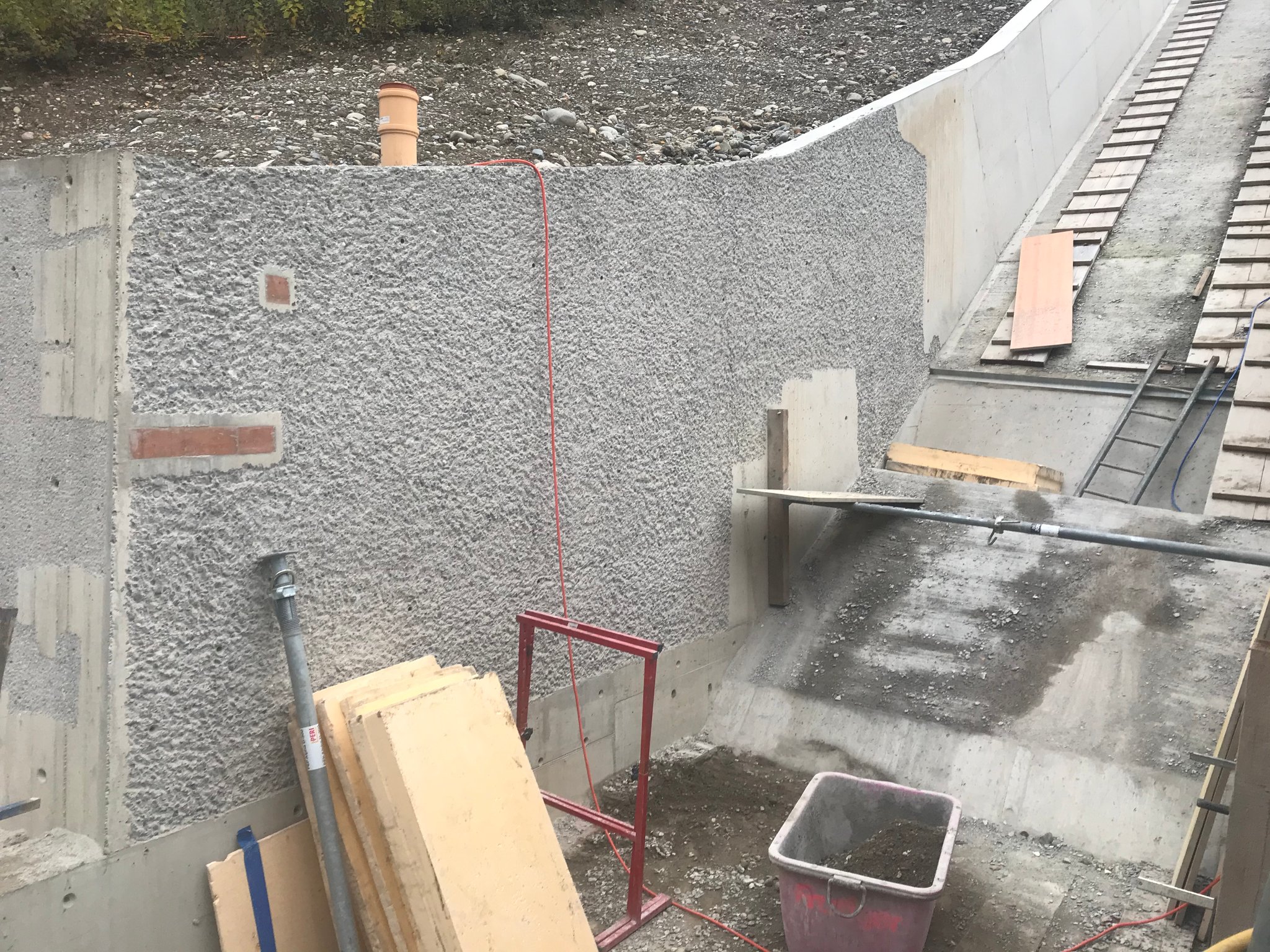 Eine spezielle Herausforderung war das Wasser, dass vom Hang in den Keller drückte. Um dieses aufzufangen und abzuführen mussten auf drei Seiten Sickerleitungen und zusätzlich ein Pumpschacht verlegt werden.
