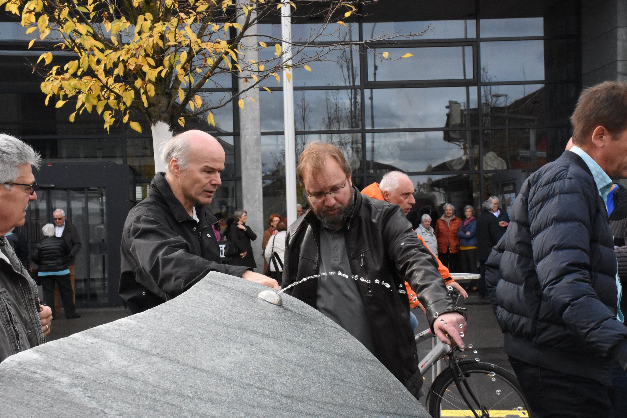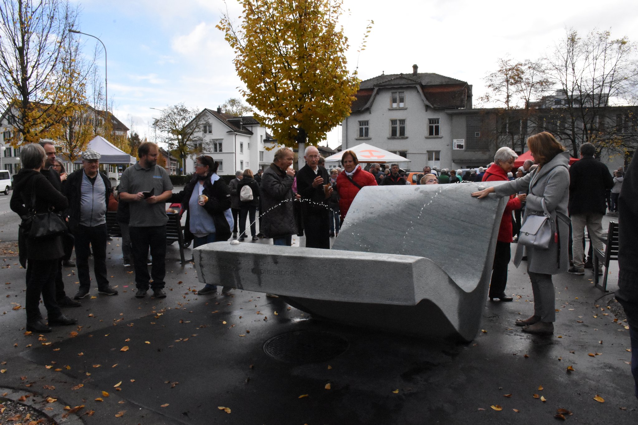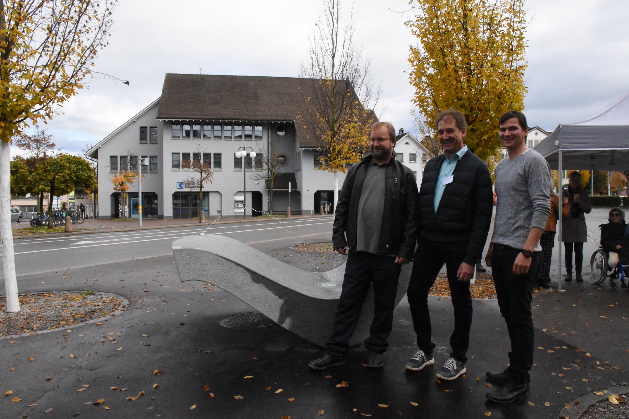 Feierliche Enthüllung des Brunnens mit diversen Rednern der Stadt Dübendorf und der Wasserversorgung Dübendorf. Neben lobenden Worten gab es auch Speiss und Trank.